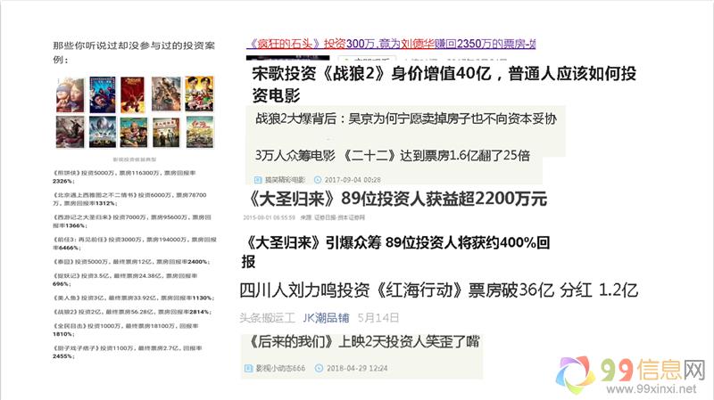 近几年,越来越多其他行业领域大企业切入影视行业,离不开电影市场大红利的巨大驱动,如北京旅游、阿里、万达等行业佼佼者都已进入影视行业,成为电影出品公司、开展电影产业链业务等,共享电影市场发展红利来源www.99xinxi.net。与此同时,为适应中国电影市场的发展需求,影视平台的出现与发展,为更多人进入电影市场提供平台入口,越来越多普通人通过投资电影实现快速赚钱。